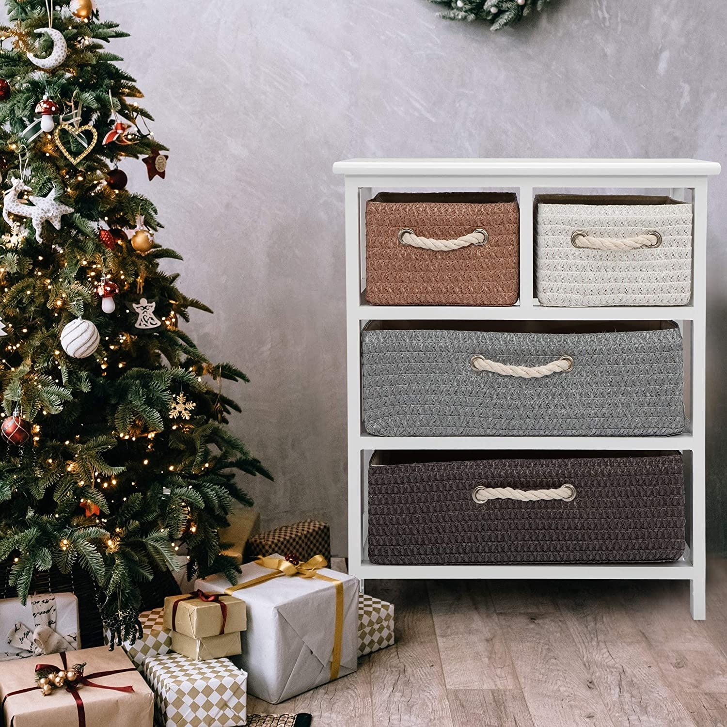 3-Layer Wood Nightstand, Storage Table with 4 Woven Basket