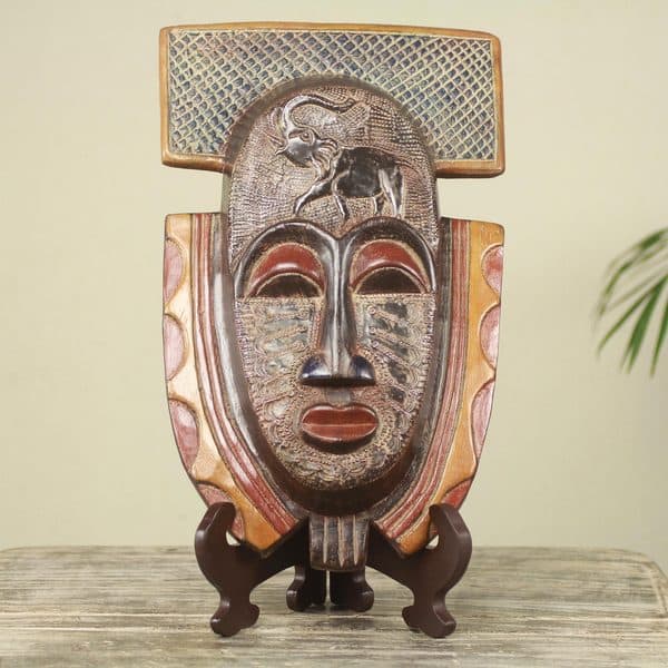 Handmade Sese Wood 'Royal Elephant' African Mask and Stand (Ghana) - Multi-color