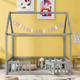Full/Twin Size Wooden Bed with House Roof Frame and Fence Guardrails