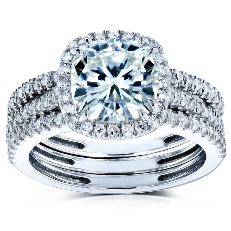 Annello by Kobelli 14k White Gold 2 2/5ct TGW Cushion Forever One Moissanite and Diamond Halo Bridal Rings Set (DEF/VS, GH/I)