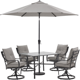 Hanover Lavallette 5-Piece Dining Set in Silver Linings with 4 Swivel Rockers, 42-In. Square Glass-Top Table, Umbrella, and Base