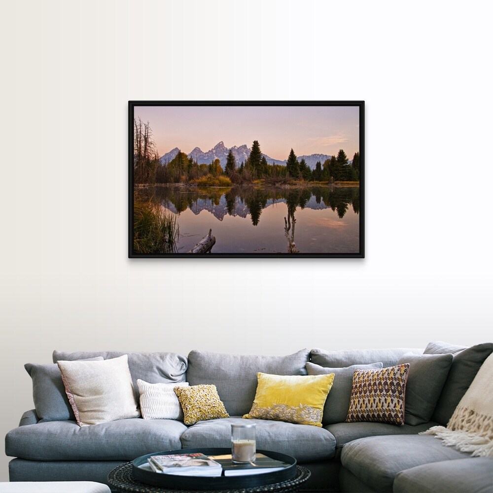 "Reflection of pine trees in lake at sunrise, Grand Teton National Park." Black Float Frame Canvas Art