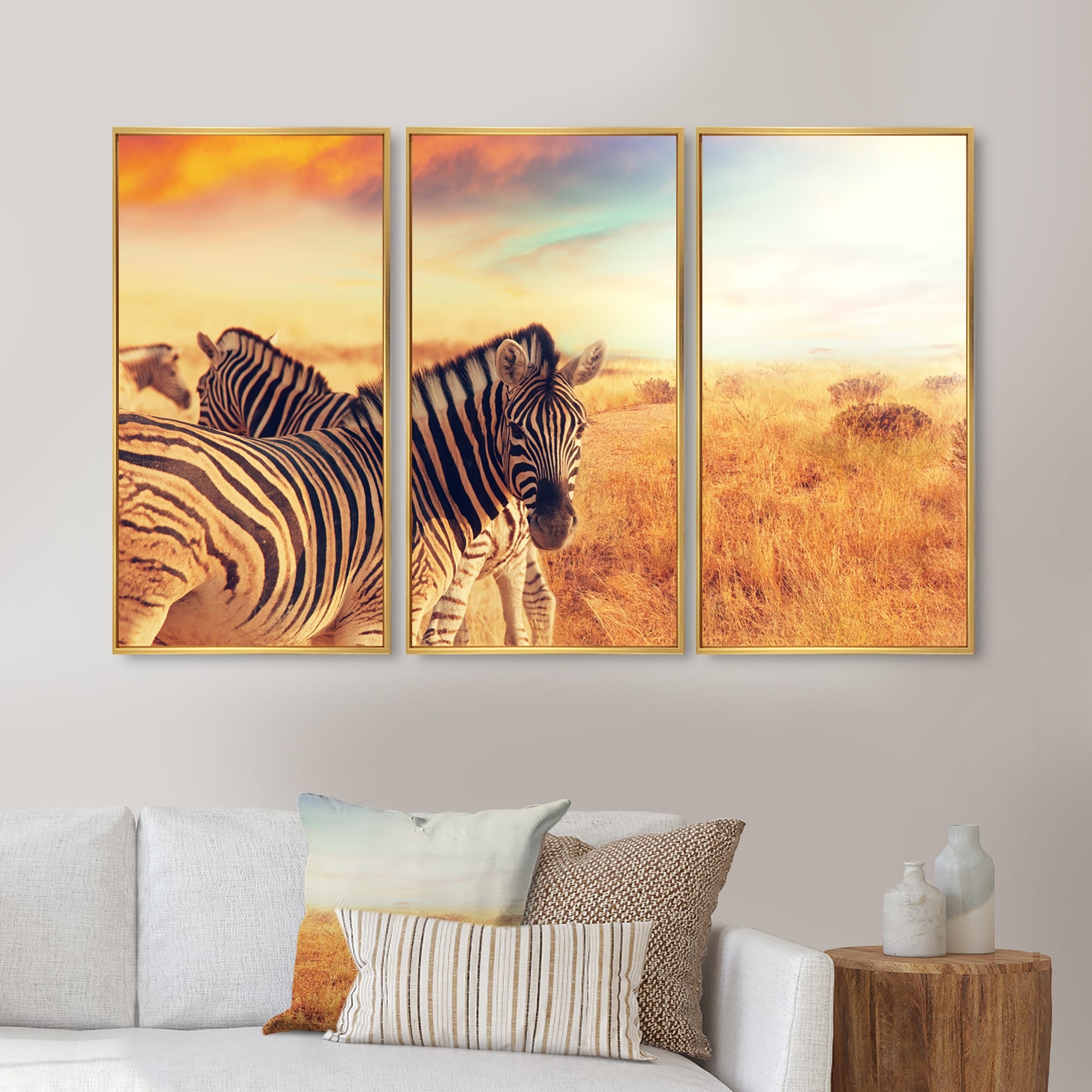 Designart "Zebras Herd in Field At Sunset" Animal Framed Wall Art Set of 3 - 4 Colors of Frames
