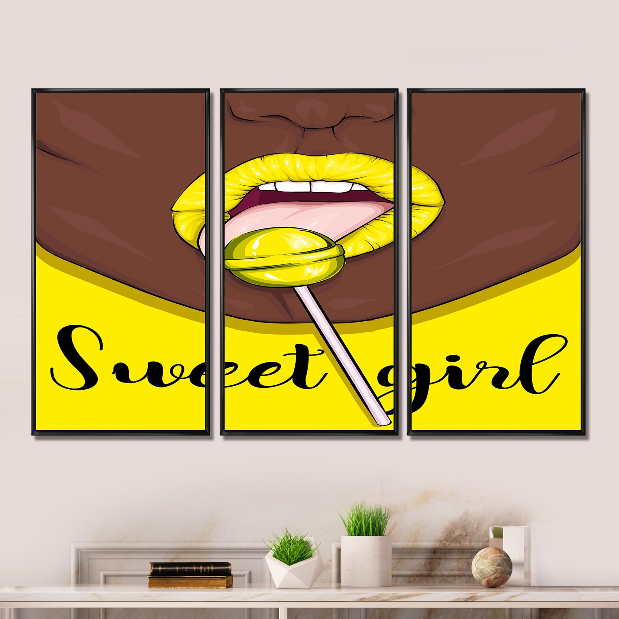 Designart "Girl Licking Yellow Candy" Modern Framed Wall Decor Set of 3 - 4 Colors of Frames