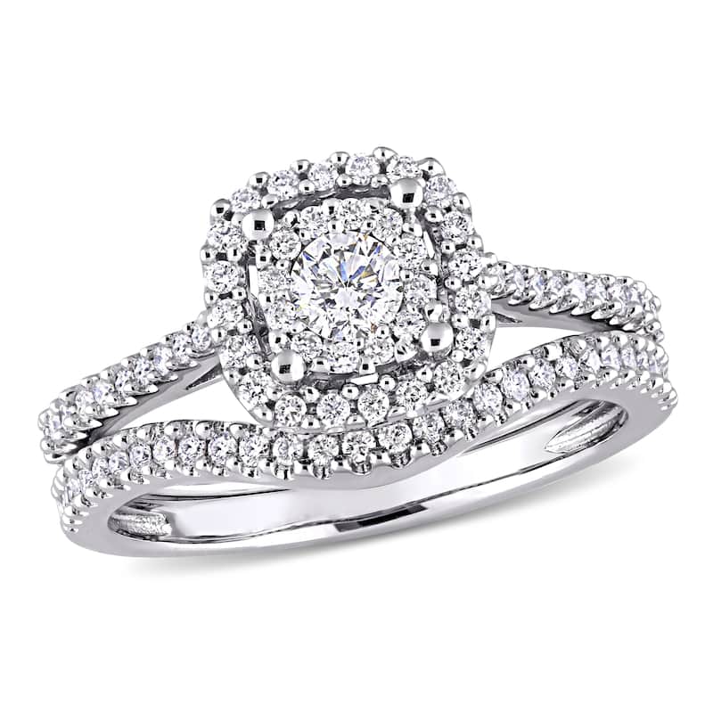 10k White Gold 1ct TDW Diamond Halo Wedding Ring Set