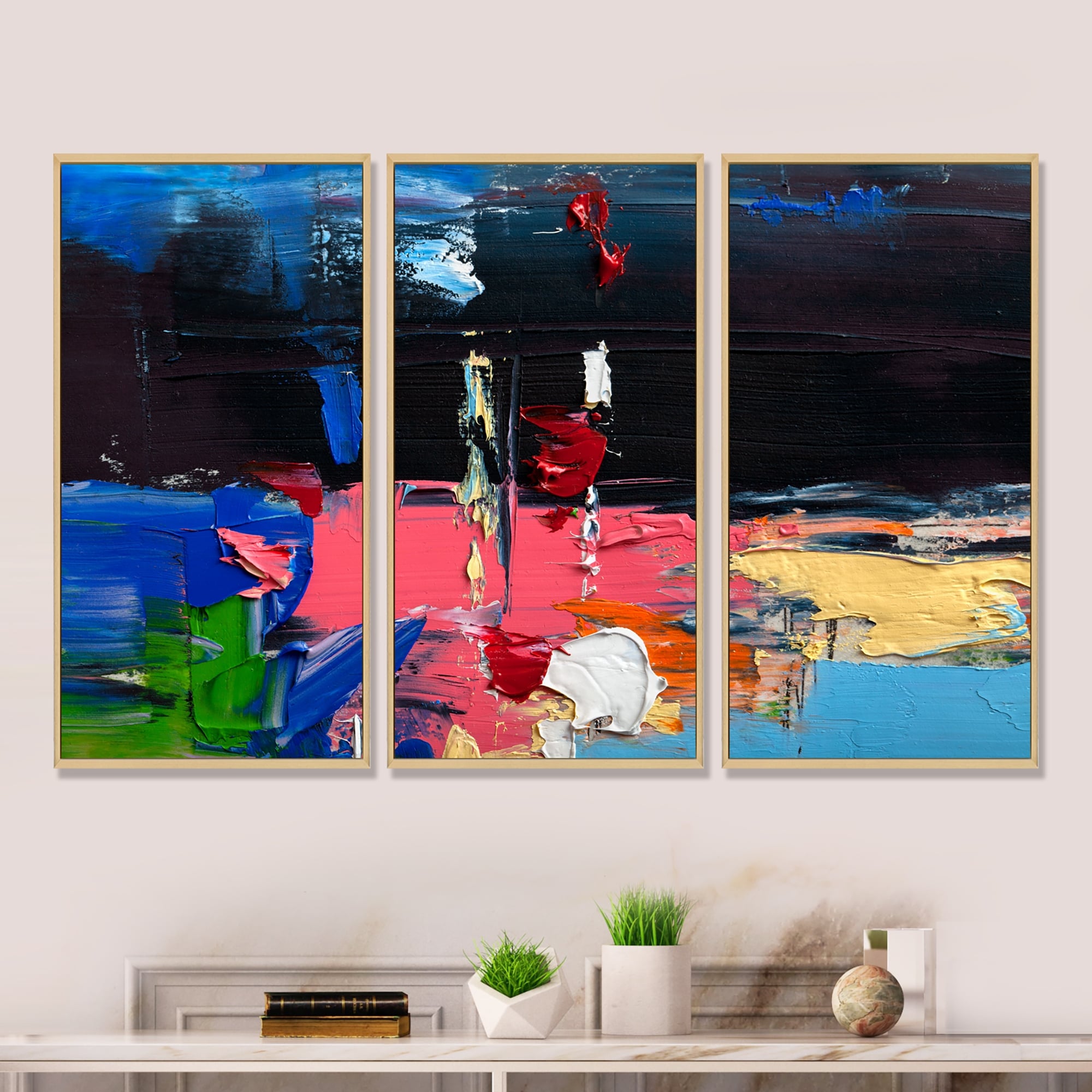 Designart "Oil Brushed Colorfields II" Modern Framed Artwork Set of 3 - 4 Colors of Frames