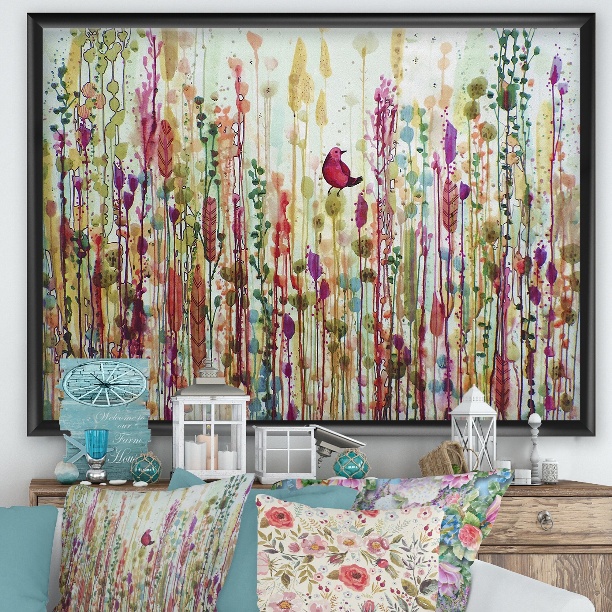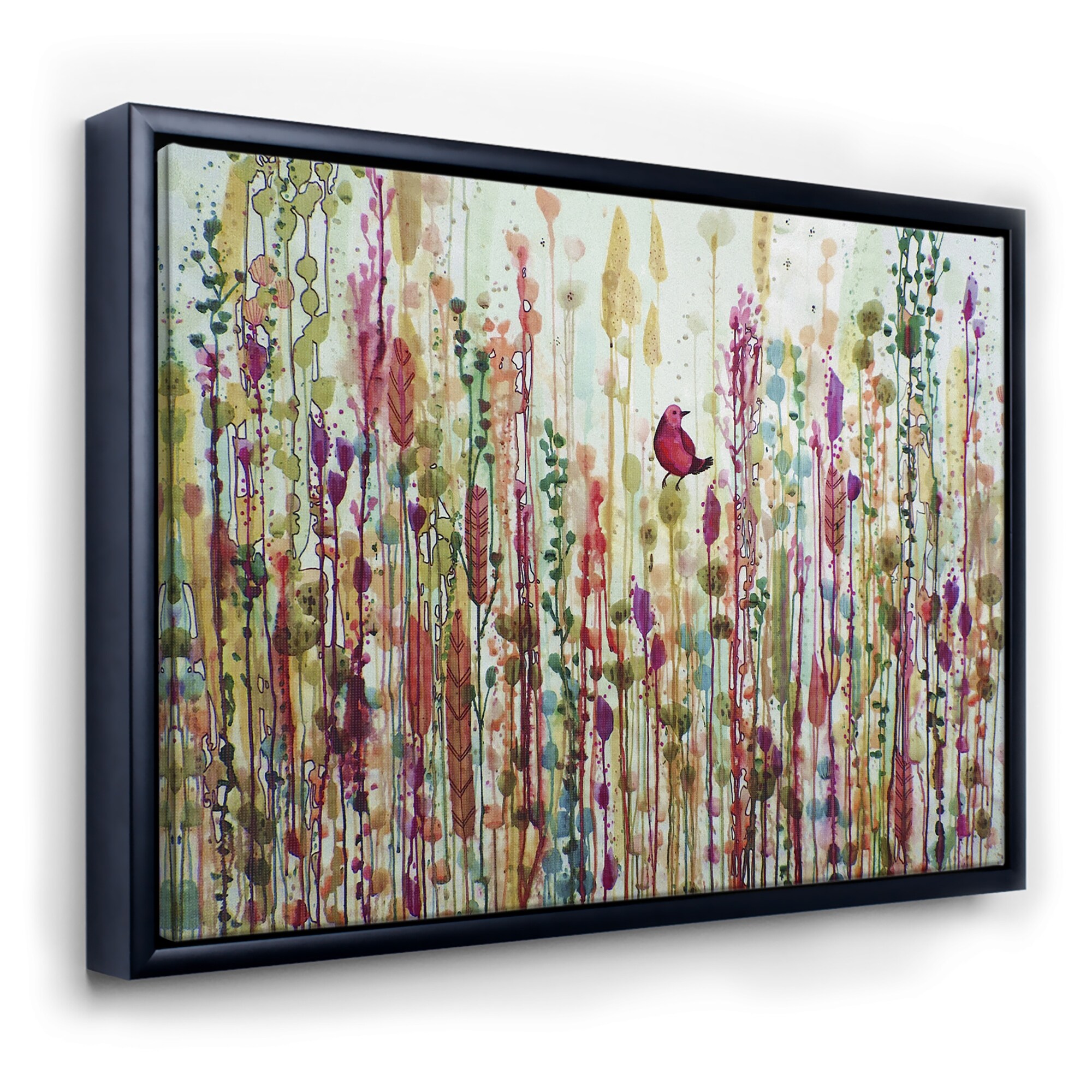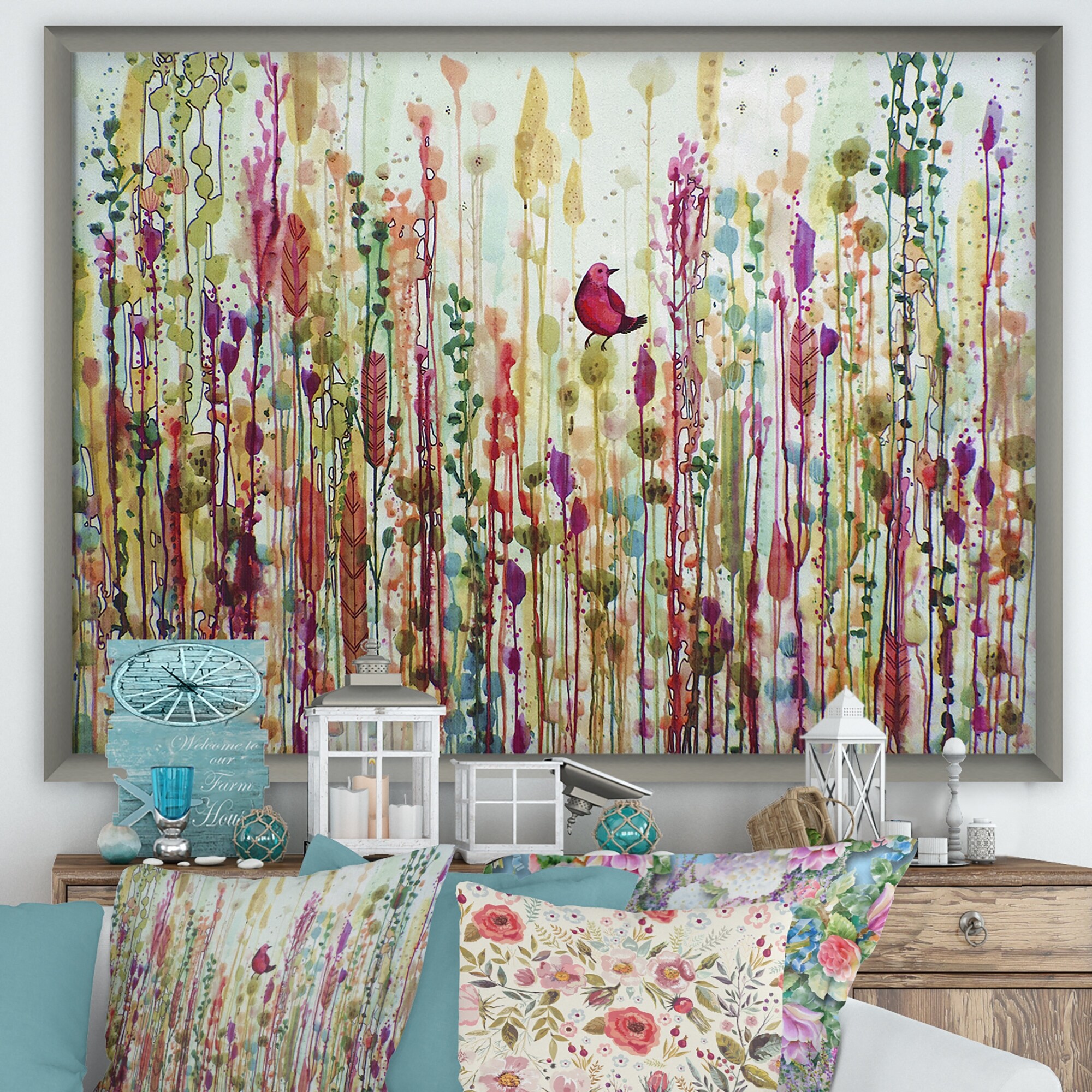 Designart "Red Bird in Color Meadow" Cottage Framed Canvas Artwork Print