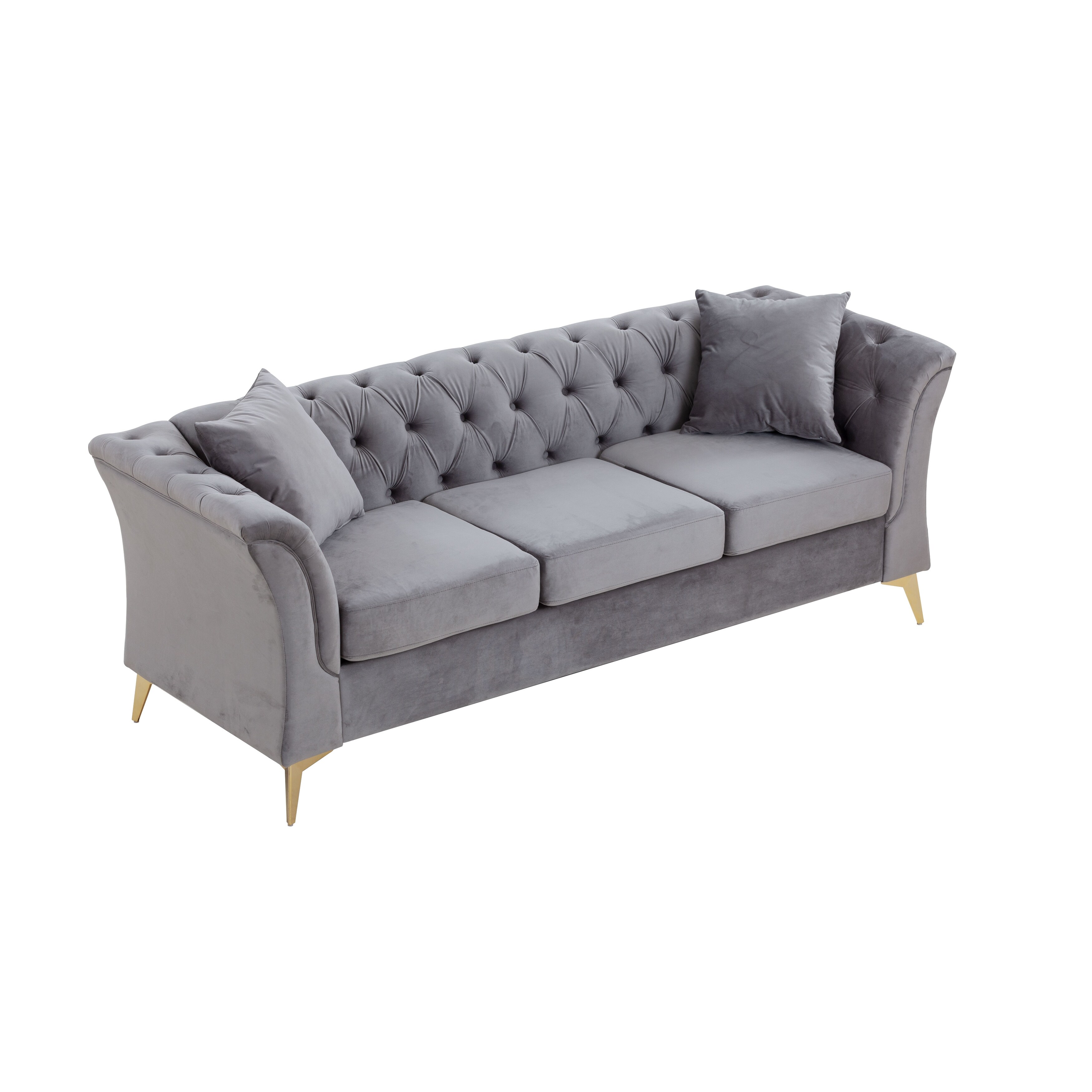 3 Seat Velvet Padded Seat Sofa Tufted Finish Living Room Sofa with Removable Back Cushion & Reversible & Metal Legs, Pillows