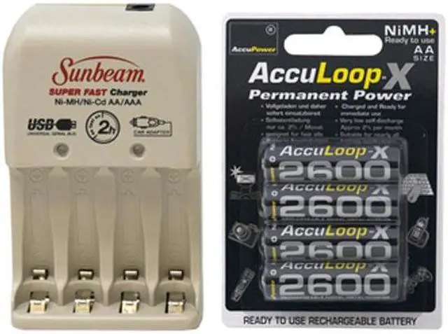 Sunbeam AA / AAA Battery Charger + 4 AA AccuPower AccuLoop-X NiMH Batteries (2600 mAh)