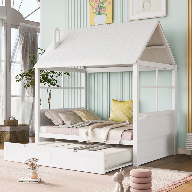 Full Size Solid Wood Kid's Bed with Twin Sizw Trundle Bed, House-Shaped Frame and Wood Slats