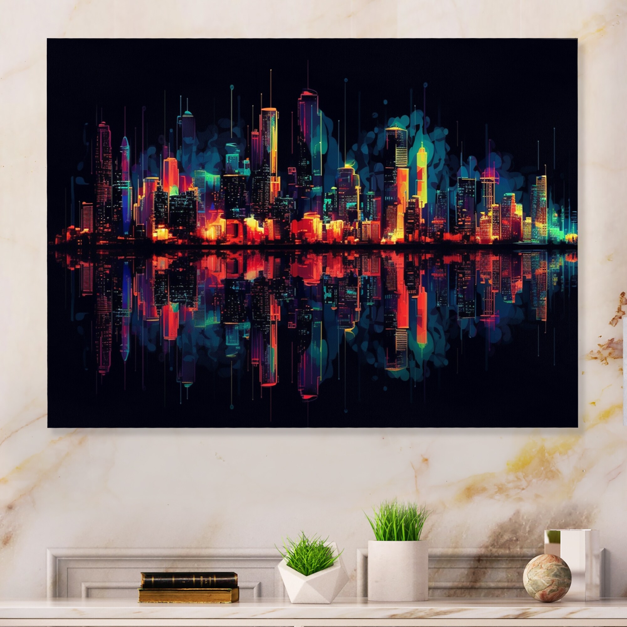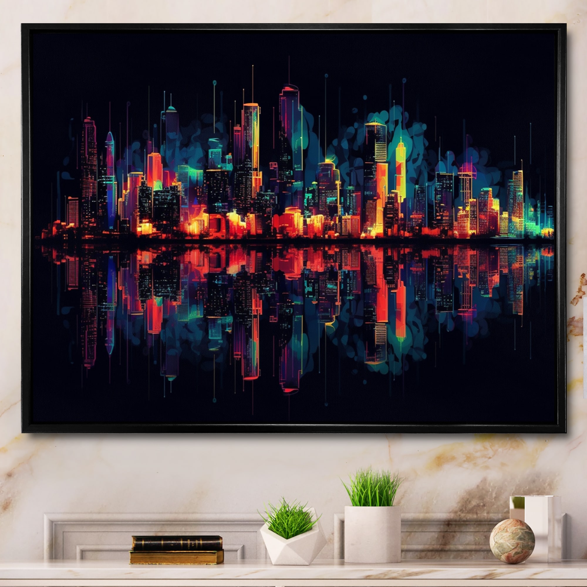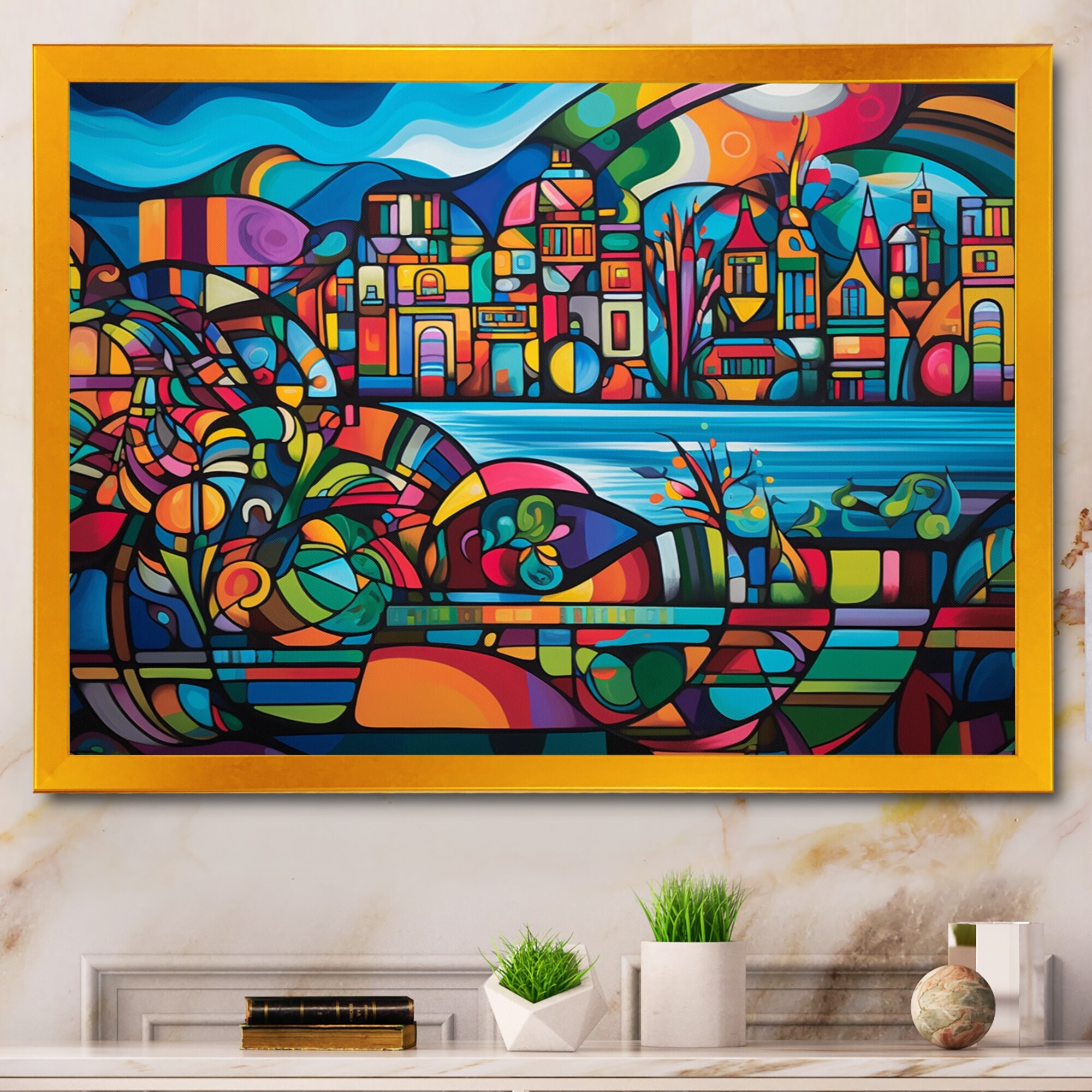 Designart "Colorful Whimsical Skyline Ii" City Art Deco Framed Canvas Wall Art