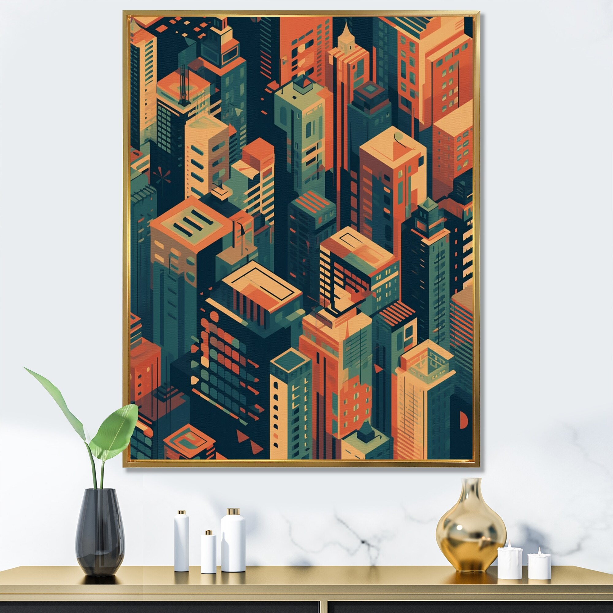 Designart "Orange And Green Cityscape Unveiled" City Art Deco Framed Wall Decor