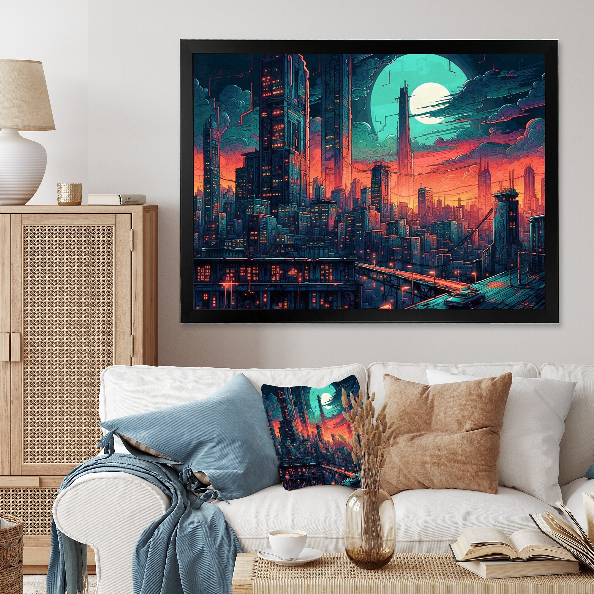 Designart "Blue And Green Electrifying Skylines" City Art Deco Framed Canvas Wall Art