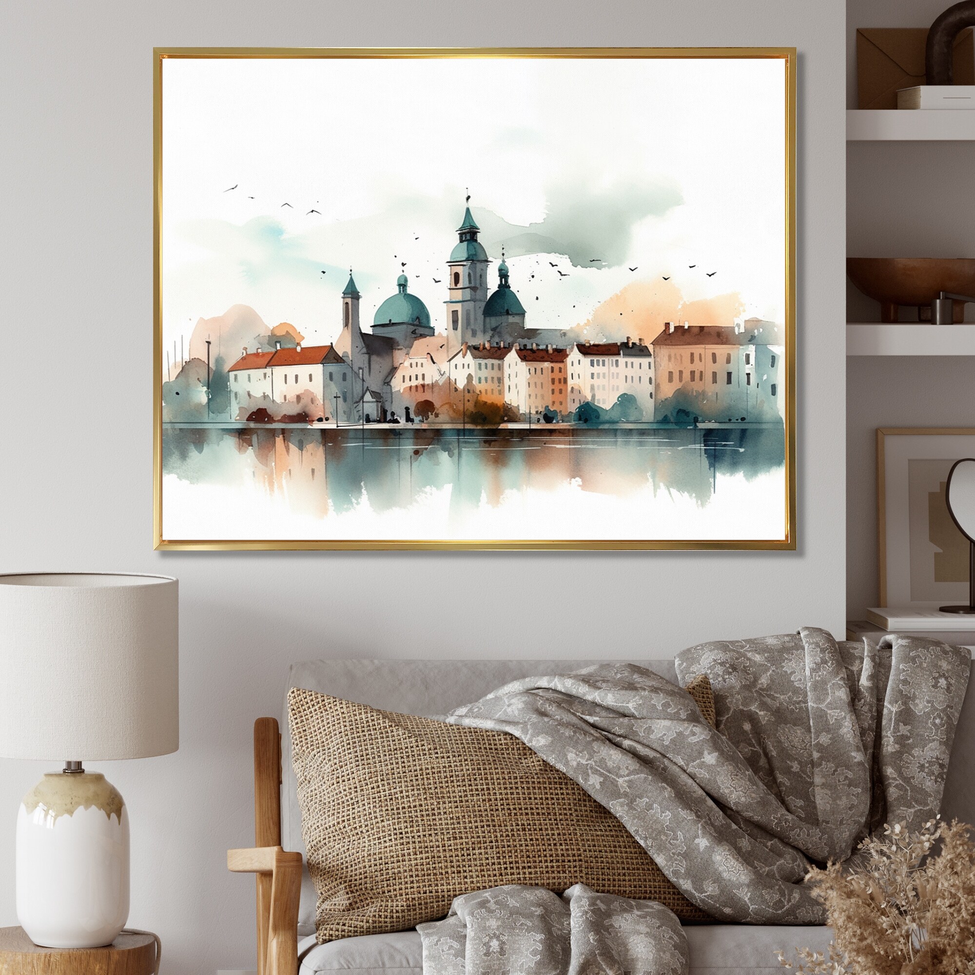 Designart "Beige And Blue Retro Radiance" City Art Deco Framed Canvas Wall Art
