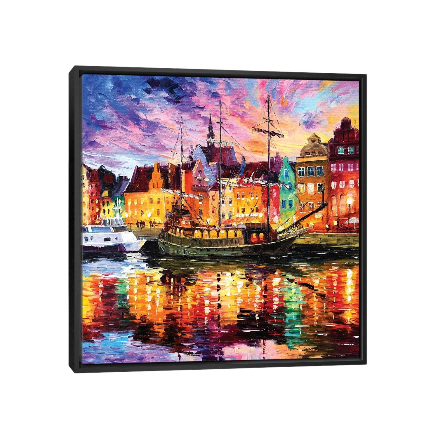 "Waterfront at dusk." Black Float Frame Canvas Art